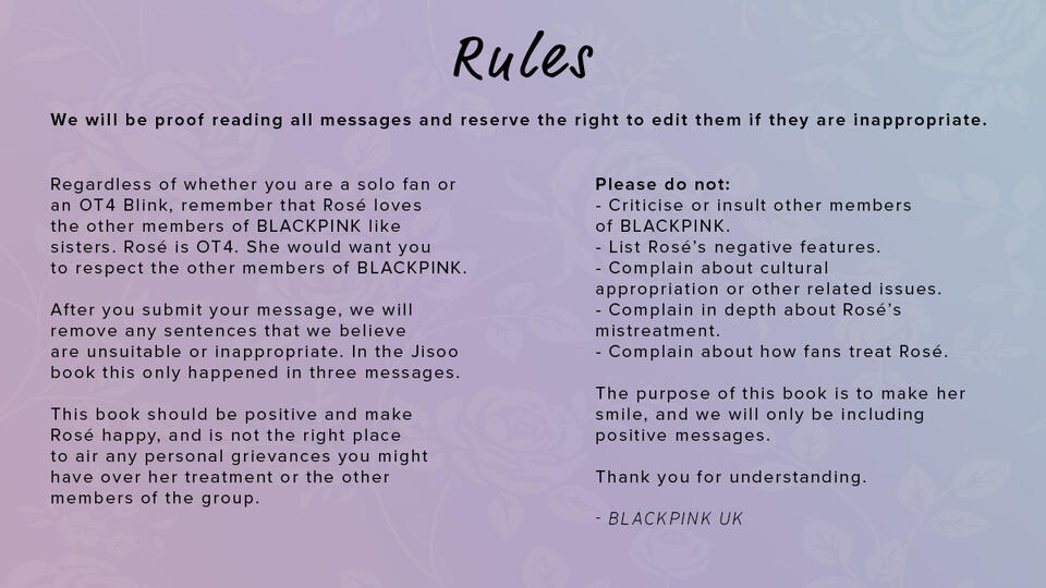 Blinks are invited to write messages for Rosé, which will be compiled into a professionally printed hardback book & delivered to her via @BLACKPINK at YG.